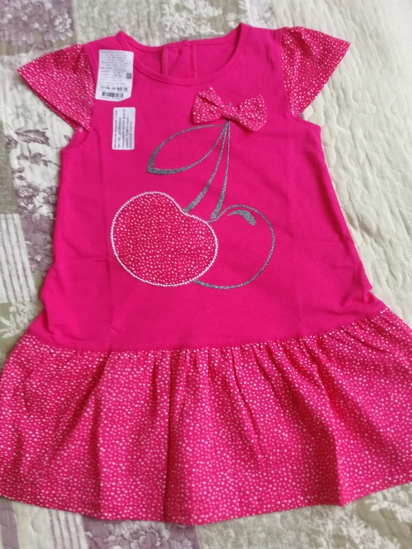 Платье отличное! Красивый, яркий цвет,сшито аккуратно. На лето замечательный вариант, т.к. ткань (кулирка) нежаркая, хорошо дышит. На рост 110 подошел соответствующий размер.