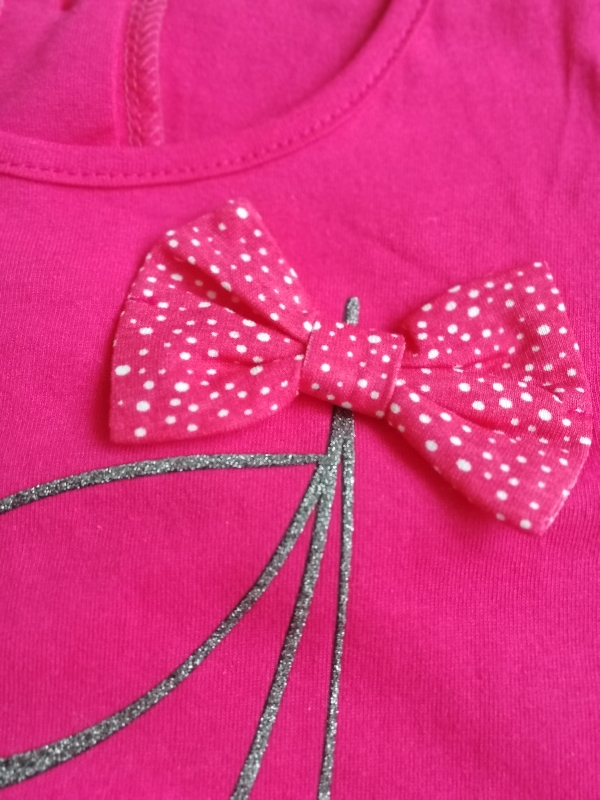 Платье для девочки. Ткань кулирное полотно. Полуприталенный крой, отрезная юбочка на заниженной талии. Рукав «крылышко» со сборкой. Застежка по спинке на планку с пуговицами. На полочке объемный бант, принт и вышивка, украшенный блестками и бусинами. Очень женственное - такое будет только у вашей принцессы! emoji_124