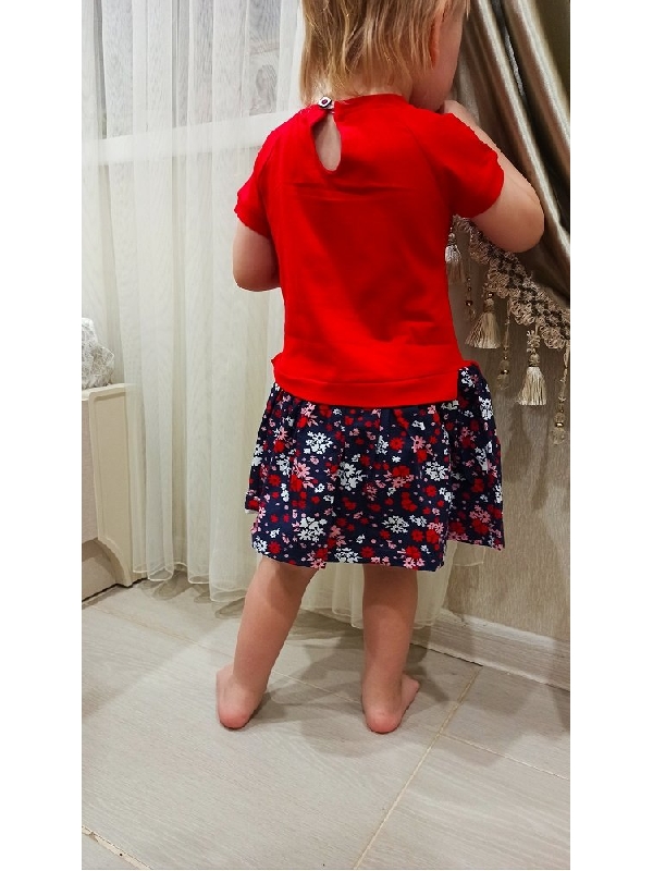 Милое платьице для девочек ясельного возраста. Платье из натурального хлопка с лайкрой. Эластичная ткань прекрасно садится по фигуре и не стесняет движений активного ребенка. Заниженная линия талии, от бедра идет пышная яркая юбка. Верхняя часть напоминает футболку.