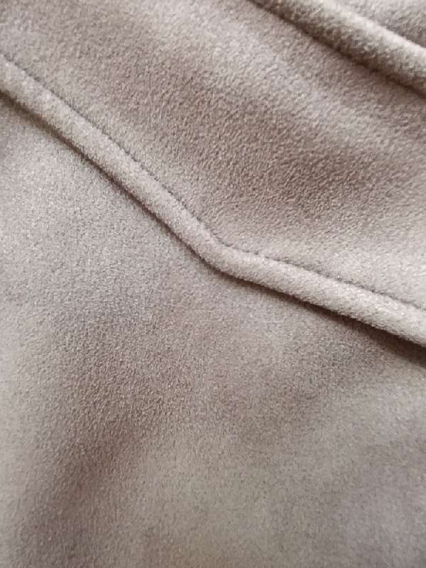 Коричневый брючный костюм выполнен из экозамши ― плотного и мягкого материала.