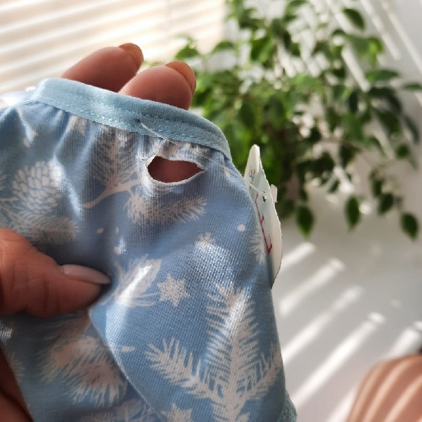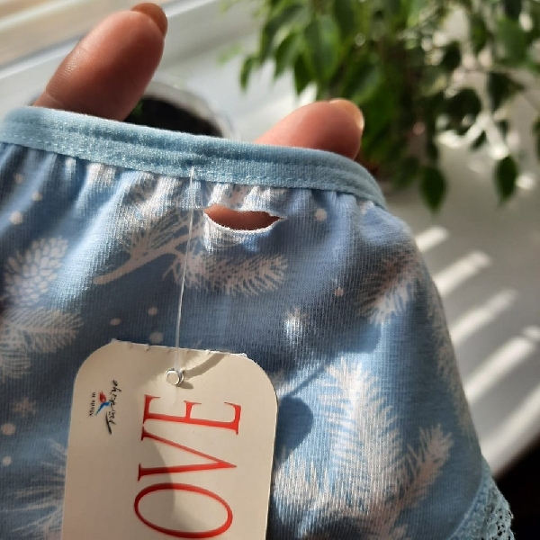 На передней части возле этикетки огромная прорезь. Не поверю, что тот, кто упаковывал, этого не заметил. Трусы на выброс