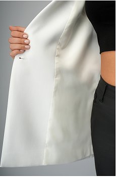 Лацканы вырисовывают утончённый V-вырез, который делает акцент на зоне декольте и шее. Жилет с отложным английским воротником застегивается на одну пуговицу в районе талии, плечи дополнены подплечниками, которые будут сохранять форму и скорректируют фигуру.
