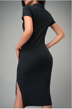 Облегающий силуэт подчеркивает фигуру, а v вырез с отложным воротником добавляет аккуратный акцент в духе спортивного стиля. Разрез в боковом шве делает длинное платье не только стильным, но и удобным в движении. Короткий рукав подчеркивает летний характер модели и придает образу легкость.