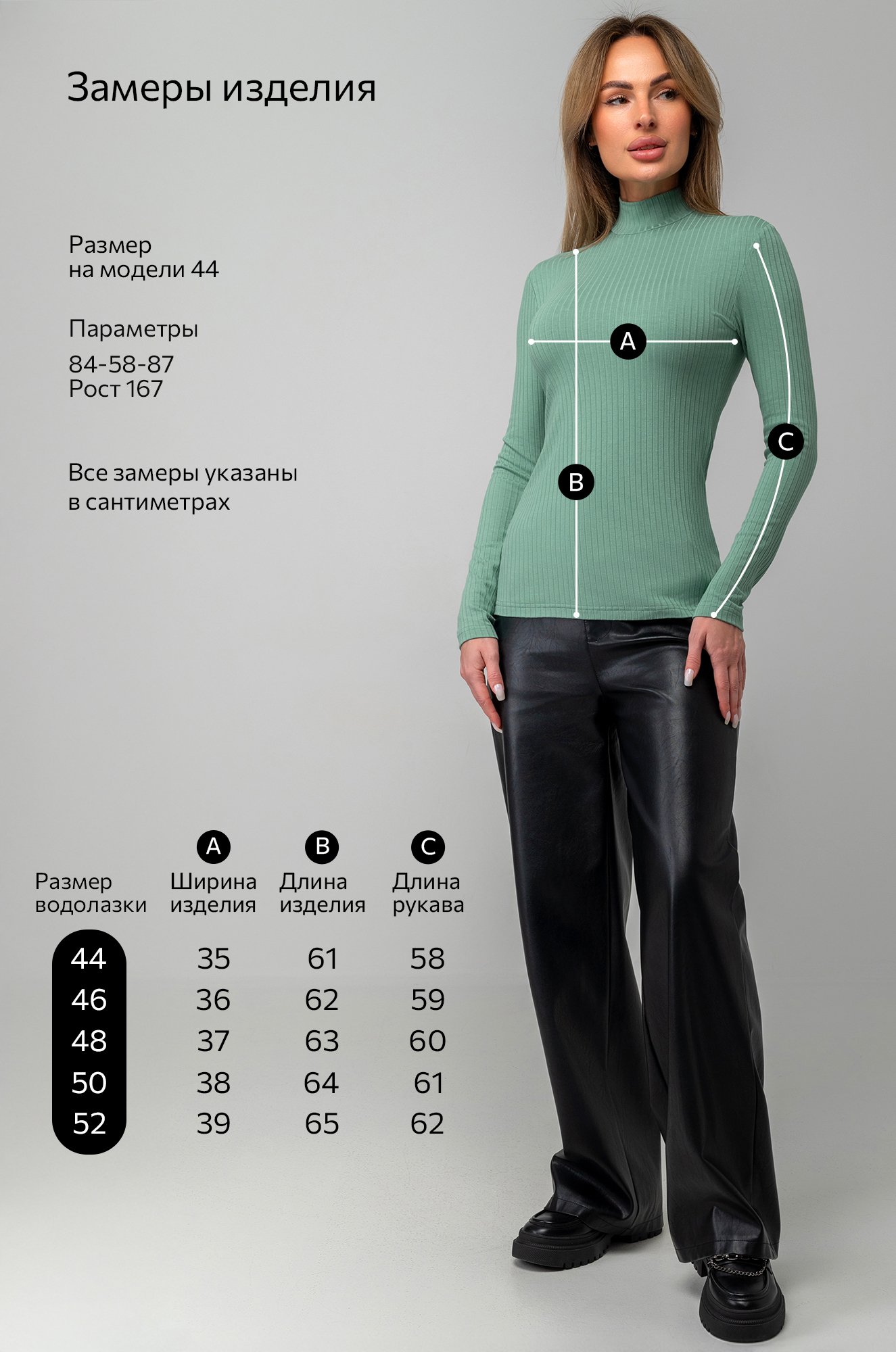 Модель Ирина, рост 167 см, параметры 84-58-87 см. На ней размер 44.